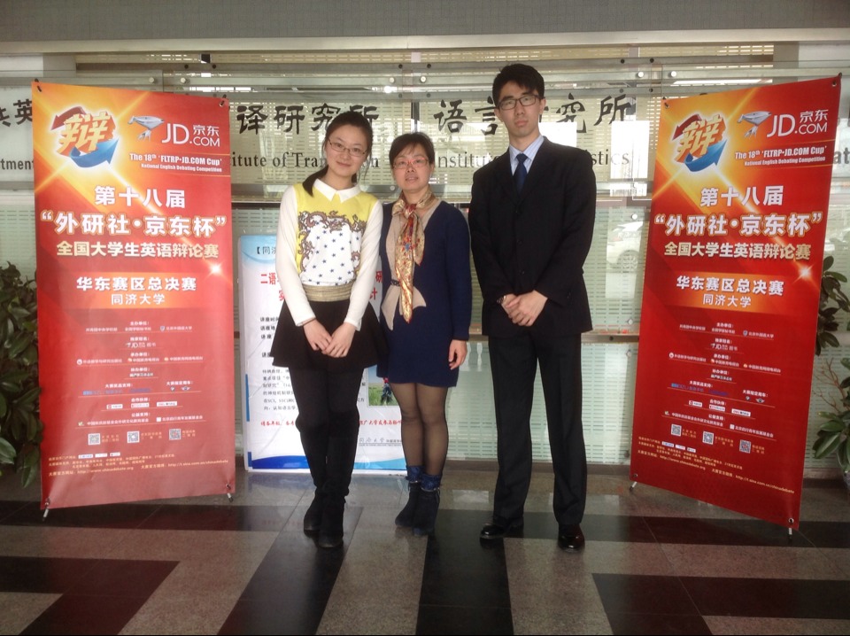 2015年3月27日至3月29日,第十八届“外研社?京东杯”全国大学生英语辩论赛华东地区决赛在同济大学举行,我校外国语学院李芳老师带领外国语学院商务英语专业12级姜文杰、法学院海商法专业14级于心洋两名学生组成的SMU代表队参赛,在60所高校代表队中表现优秀,荣获华东区三等奖。