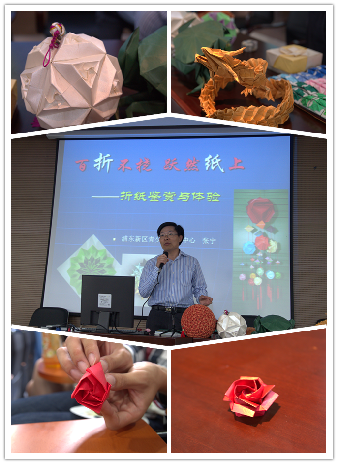 2015年5月27日星期三下午,上海浦东新区青少年活动中心的张宁老师受邀在外国语学院报告厅为上海海事大学的师生们开展了题为“百折不挠,跃然纸上”的折纸鉴赏与体验会。