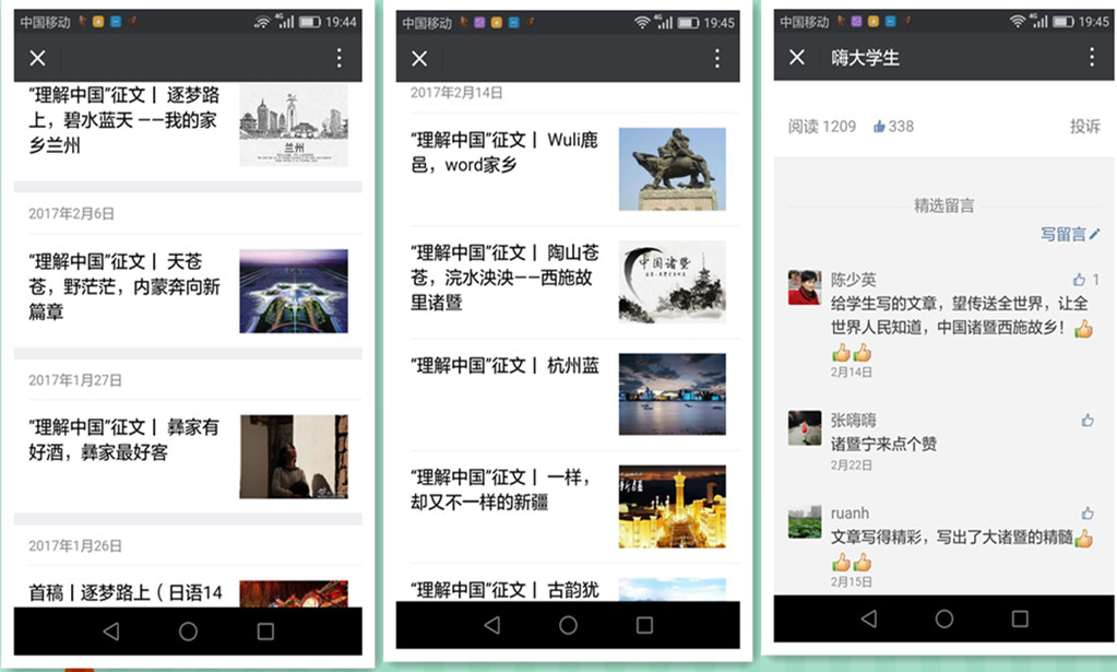 来自外语、物流、信工、海科等学院的本科生、研究生发来应征稿件,外国语学院“嗨大学生”、“外院PBSS”两个微信公众号及时发布,各学院师生给予大量关注和好评。本次活动所推送征文阅读量合计过5000次,其中英商141班李筱婕所写《陶山苍苍,浣水泱泱——西施故里诸暨》阅读量2000人次,点赞数600次。