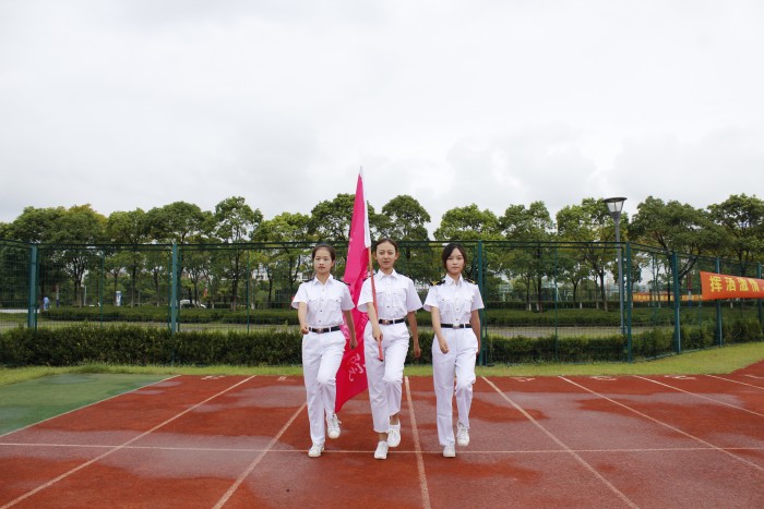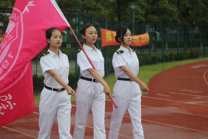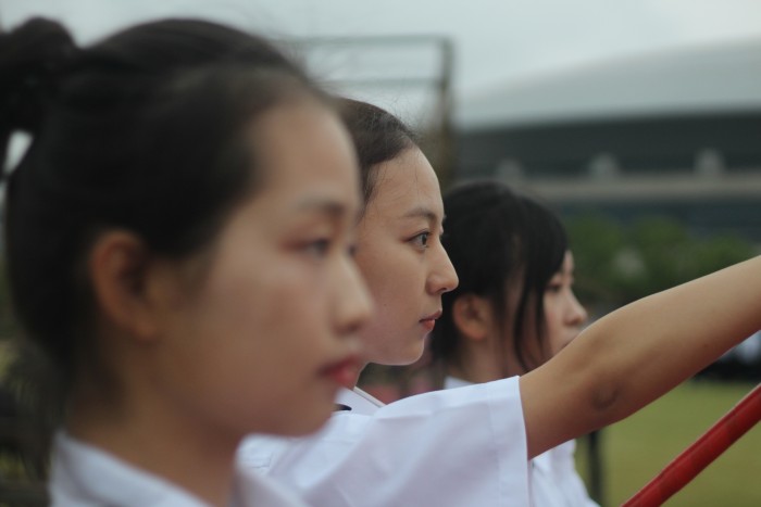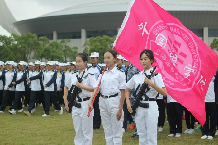 而在外院新生的军训方队中,最可敬的是女生护旗手们。由于外院新生中女生居多,所以护旗手选了女生。刚开始,教官还担心护旗手是女生,执旗、劈旗有困难。然而被选中的3名护旗手巾帼不让须眉,一直在坚持着严格辛苦的训练。一次次的抬手和踢腿、长时间的站军姿更是对毅力和耐力的考验,但是不管有多辛苦,她们始终斗志昂扬,训练场上她们喊口号的声音响彻云霄,回荡在校园的各个角落。每到休息时,她们或说或笑,脸上的笑容如夏花一般灿烂,身上闪耀着令人羡慕的朝气和活力。