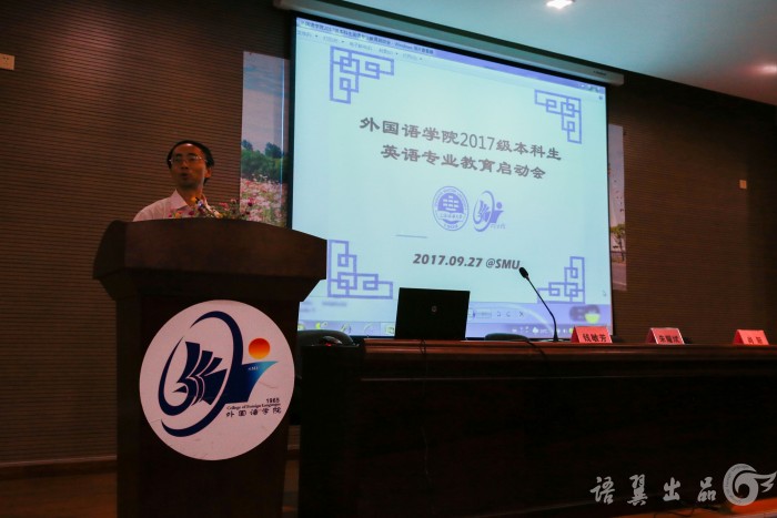 院长尚新代表外国语学院全体师生向2017级新生的到来表示热烈欢迎,并对同学们入学以来的优良表现给予充分肯定,就学院办学历史、发展前景、师资力量、专业建设、科研成果、教育资源、人才培养目标等基本情况向同学们作了简要介绍。尚新院长鼓励新同学树立“三个自信”:学科自信,相信外语专业在国家战略中的重要性;学院自信,相信外院的师资力量和硬件实力;自我自信,相信自己改变社会的能力。尚院长最后鼓励同学们珍惜时间、自我节制,正确面对挫折,有理想更要有实干,并祝愿全体同学拥有丰富多彩的大学生活,展现出真我风采。