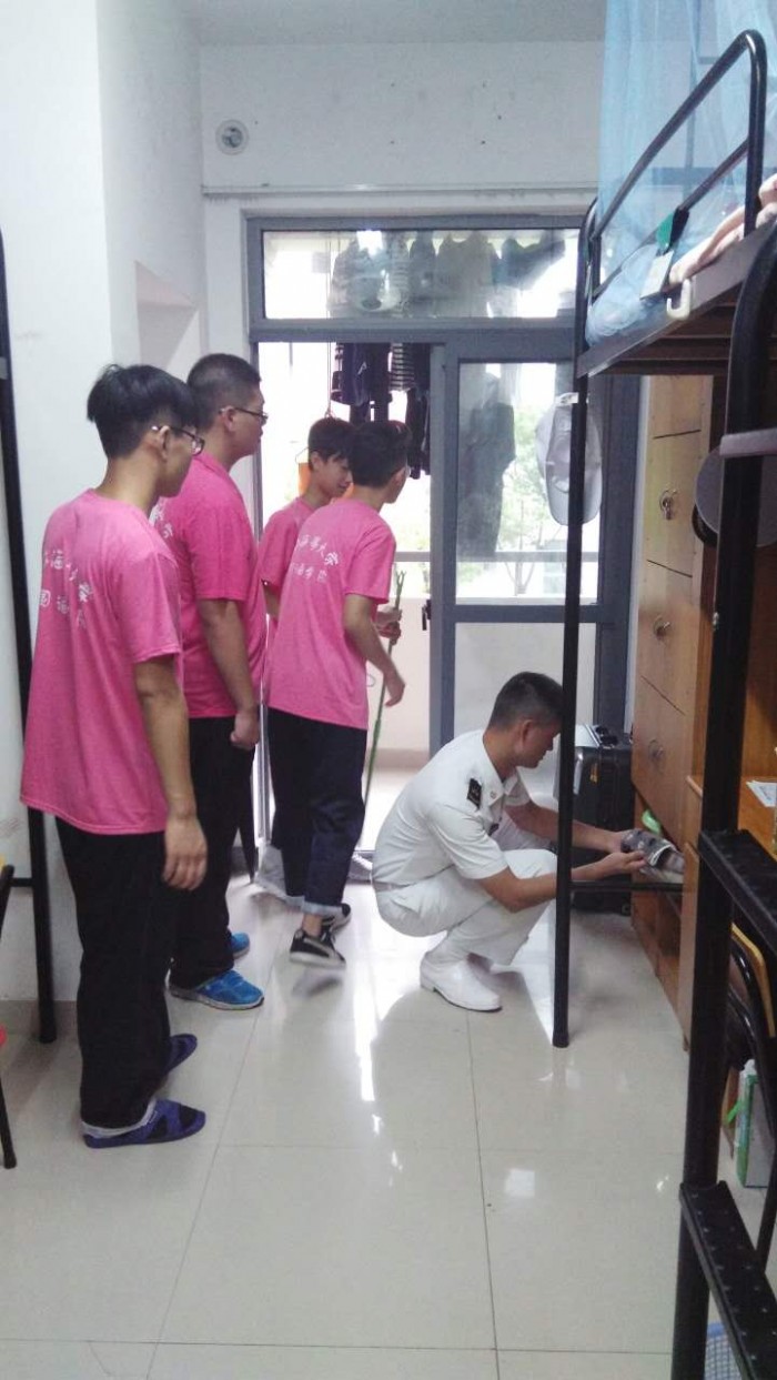 军训第一天,教官便来到学生的宿舍,示范内务整理的规范,要求学生们整齐叠放被子衣物,保持桌面干净整洁以及宿舍卫生。同学们纷纷按照军训要求,严格管理个人内务,将桌面收拾整洁,被褥叠放整齐,做到严于律己。