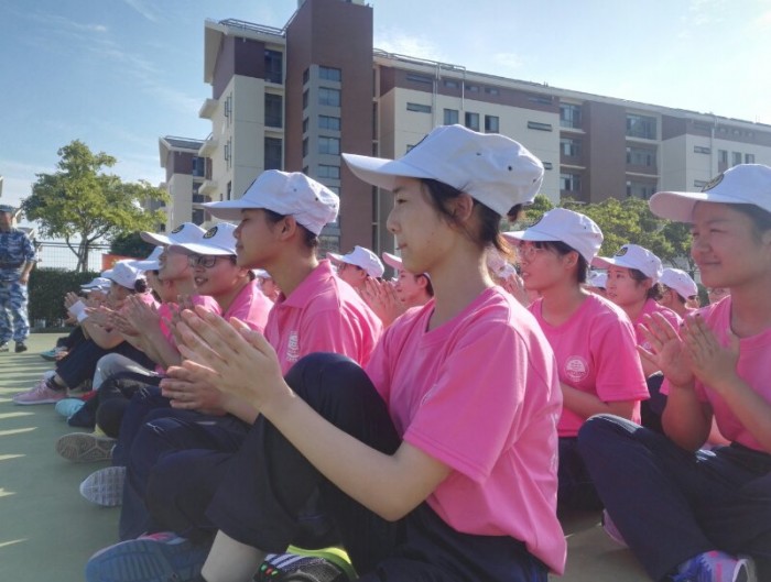 随后的训练中,学生在教官的指导下进行站军姿的训练,在高温下坚持以标准的军姿站立,展现了不怕苦、不怕累的精神,锻炼了自己的毅力。训练休息时,教官教学生们唱军歌,不同方队之间通过拉歌进行互动,让辛苦的军训多了一丝愉悦与温情,同学们也通过军训加深友谊,培养团队精神。
