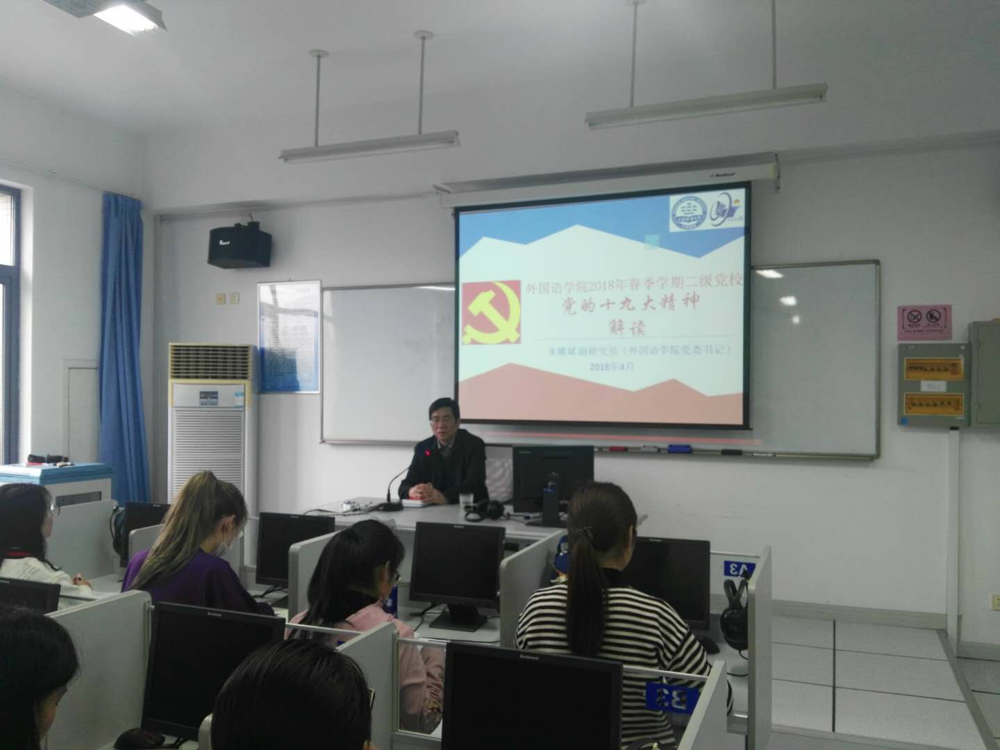 44日下午,外国语学院2018年春季学期二级党校于外语楼215室举行,学院党委书记朱耀斌以《党的十九大精神解读》为题主讲,学生办欧阳曙老师主持,来自各年级入党积极分子参加。