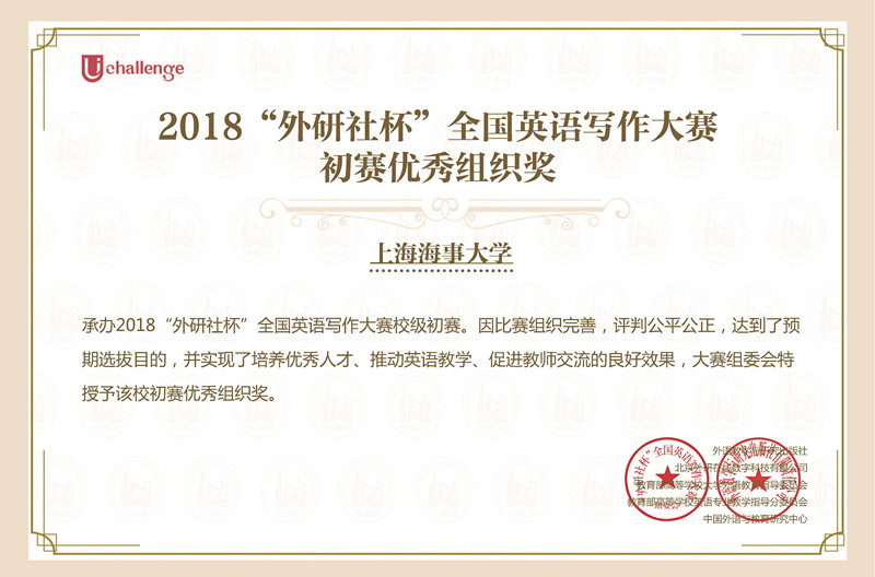 2018年“外研社杯”英语写作、阅读大赛校选赛于9月22日在外国语学院语音室顺利举行。本次比赛共接受了来自全校各二级学院的研究生、本科生400余人次的报名。根据大赛组委会的要求,初赛采用线上模式,由“iTEST大学外语测试与训练系统”发布赛题,考试结束后由评阅教师结合机器评阅情况确定成绩。最终,来自交通管理专业2017级的李皓珺、海商法专业2016级的邱宇凌同学获得“英语写作”校选赛特等奖;来自英语语言文学类专业2016级的李佳忆、海商法专业2016级的周小苡同学获得“英语阅读”特等奖;学校也同时获得由大赛组委会颁发的“初赛优秀组织奖”。以上四位同学将代表学校进入到上海市的复赛环节,预祝他们在外国语学院老师们的指导下可以取得优异成绩。本次比赛的举办给同学们展示自己提供了平台,也激发了同学们学习英语的兴趣,营造了良好的氛围。