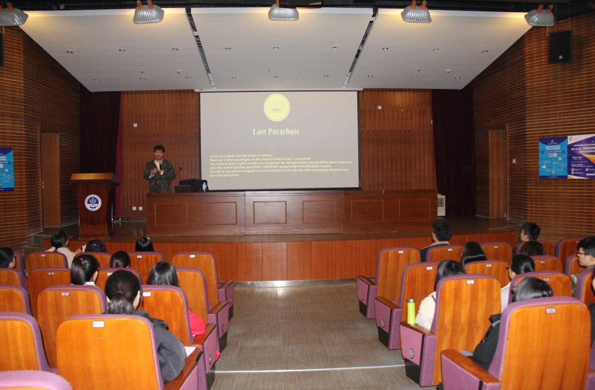 11月19日晚上,外研社英文思辨教育功勋培训师郝晓威受邀在我校科研楼报告厅为广大同学作了主题为“英国议会制辩论赛赛制介绍”的讲座。郝老师以“最后一个降落伞”游戏为切入点,让同学们选择不同的角色为自己争取最后的生机,在同学们的自我辩护中逐步深入到辩论的本质,由此向同学们介绍了英国议会制辩论赛赛制的整体流程以及每位选手在比赛中需要担任的各项任务。整场讲座准备充分、逻辑清晰,具体生动,深受在场的师生好评。郝晓威老师此次莅临讲座,让学校师生认识到了英文思辨的内涵及意义,详细地了解到什么是英辩议会制辩论、如何分析辩题以及如何在日常学习中备赛;不仅教会了学生如何入门,也教会了老师如何在教学中提高,对我校的英辩教学起到了积极的推进作用。