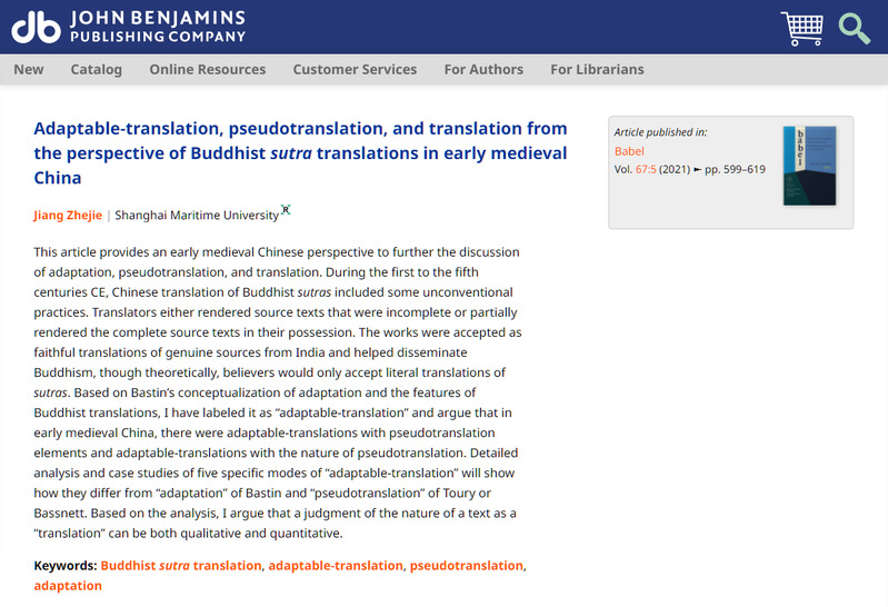 Recently, Associate Professor Jiang Zhejie of the College of Foreign Languages published a paper in Babel: International Journal of Translation (SSCI; A&HCI) -- Adaptable-translation, pseudotranslation, and translation from the perspective of Buddhist sutra translations in early medieval China (https://www.benjamins.com/catalog/babel.00238.jia). The paper analyzes and criticizes the concept of pseudotranslation proposed by Gideon Toury, a leading authority in Western translation studies, based on traditional Chinese translation practices, and gives voice to Chinese translation studies in the Western academic discourse.