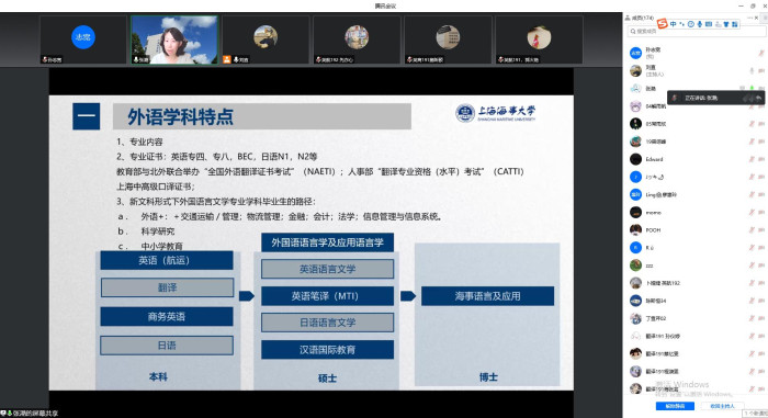 During the lecture, Prof. Zhang analyzed and introduced four aspects: the characteristics of foreign language disciplines, the intention to seek employment after graduation, the social development situation and the employment of undergraduate students. She said that English is the official language of shipping as stipulated by the International Maritime Organization, and it has a broad development prospect for professional study, practice and further study and employment relying on the school platform. At the same time, President Zhang emphasized that the shipping industry is recovering day by day and the recruitment demand of shipping logistics enterprises is increasing, so she suggested that everyone should change the concept of job hunting and take the examination for public service and editorial as the career choice instead of a single career goal, and actively join the shipping logistics career of the motherland. President Zhang also gave a detailed explanation of the postgraduate training program, international cooperation, integration of industry and education, and the development of graduates, so that the undergraduate students had a more in-depth understanding of applying for the postgraduate majors of the college.