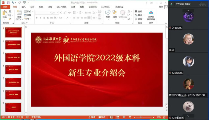 In order to enhance the understanding of the subject settings and professional training directions of the undergraduate students of Class 2022, the College of Foreign Languages conducted an introduction meeting for undergraduate students' majors through Tencent Conference in the afternoon of October 12. The meeting was conducted by Guo Haixia, Vice Dean of the College, Zhou Xiang, Head of English (Shipping) Department, Song Zhiping, Head of Translation Department, Wang Xian, Head of Business English Department, and Xu Xiuzhi, Head of Japanese Department, and presided over by Su Haowen, counselor of 2022 undergraduate students, with the participation of all 2022 undergraduate students.