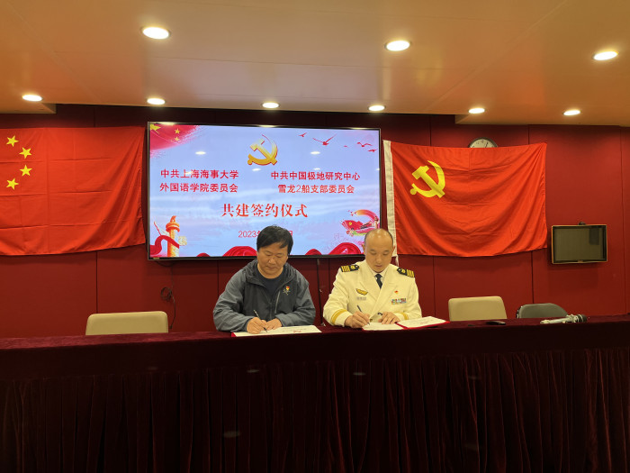 Captain Xiao Zhiming and Political Commissar Chen Xiaodong gave a brief introduction to the party building, scientific research and navigation carried out by Xuelong 2 in the past year. Secretary Li Pingyou and Political Commissar Chen Xiaodong signed the party building agreement, and President Zhang Yan and Captain Xiao Zhiming presented each other books and postcards. Secretary Li Pinyou said that the college is carrying out in-depth education and study on the theme of socialist thought of Chinese characteristics in the new era of Xi Jinping, and hoped to take the visit and research of the research vessel Xuelong as an opportunity to further enhance the concept and ability of all the faculty and students to serve the construction of a strong maritime country and a strong shipping country.