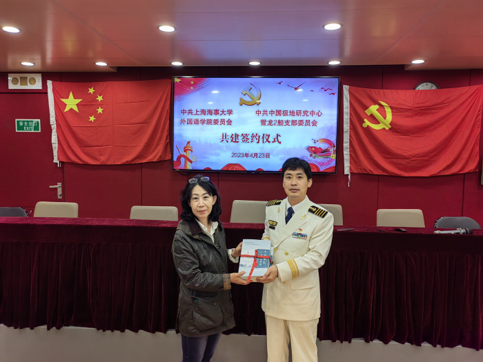 On April 23, in order to conscientiously study and implement the socialist thought of Xi Jinping with Chinese characteristics in the new era, promote the theme education in an orderly and effective manner, and at the same time further enhance the college's concept of training talents with maritime language characteristics, and do a good job in supporting the main disciplines around the school such as shipping, logistics and marine. The faculty and staff of the College of Foreign Languages organized a visit to Xuelong 2 to carry out the party building and research activities. Captain Xiao Zhiming and Political Commissar Chen Xiaodong of Xuelong 2 expressed a warm welcome to Secretary Li Pingyou and President Zhang Yan and his party.