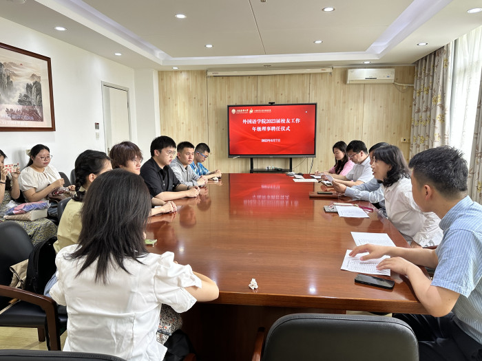 6月7日上午,外国语学院2023届校友工作年级理事聘任仪式在外语楼515会议室举行。外国语学院党委书记李品友,院长张滟,党委副书记刘直,毕业班辅导员孙志宽、苏昊文以及2023届校友工作年级理事参加了此次活动,会议由毕业班辅导员孙志宽主持。