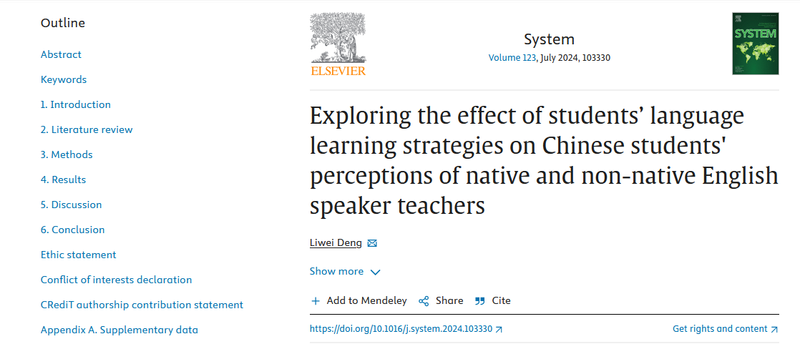 Recently, the top international journal System in the field of linguistics (SSCI Region 1 Journal of the Humanities field of the Chinese Academy of Sciences) published online the latest research results of Deng Liwei, a teacher of our college, on student teaching evaluation. The thesis title is Exploring the effect of students' language learning strategies on Chinese students' perceptions of native and non-native English speaker teachers.