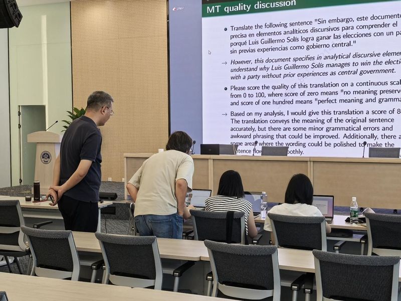 In the morning, Sharoff, a well-known professor from the University of Leeds, continued to bring us a lecture on the theme of Large Language Models. Professor Sharoff's academic expertise has led us to explore the power of large language models. He started with translation tools, explained the advantages and disadvantages of different translation tools in a simple way, and pointed out the direction of using translation tools. He then introduced the students to the evaluation of translation quality by artificial intelligence, confronting the complex relationship between humans and artificial intelligence. He said that although AI is powerful, it still has a bottleneck in dealing with complex contexts, which reflects the unique charm of the human brain.