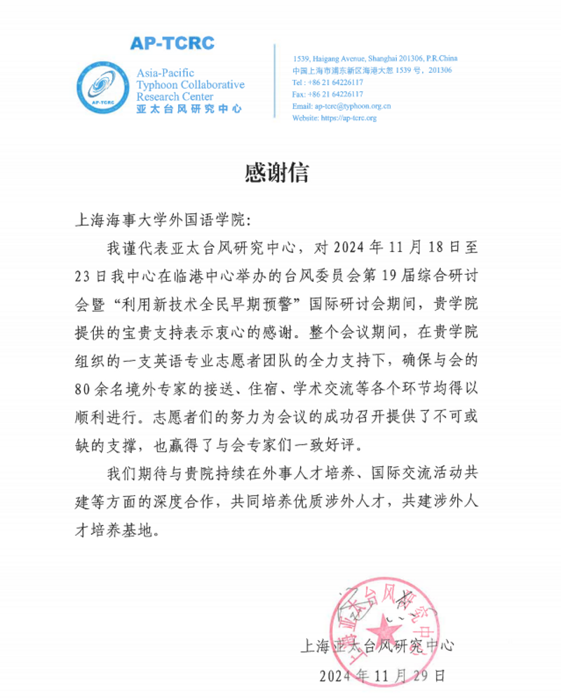 本次志愿服务得到活动主办方上海亚太台风研究中心的高度认可和赞扬,多语言服务中心将以本次活动为契机,进一步深化多语言志愿服务模式,不断提升服务能力与水平,为国际化活动提供更多语言支持。