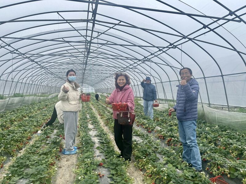 当天下午,在工作人员的引导下,学院教工们走进草莓大棚,一片生机盎然的景象映入眼帘:一垄垄翠绿的草莓苗间,点缀着一颗颗鲜红饱满的草莓,空气中弥漫着清甜的果香。采摘过程中,教职工们一边品尝新鲜的草莓,一边交流采摘心得,现场充满了欢声笑语,往日的工作压力在这一刻释放殆尽。
